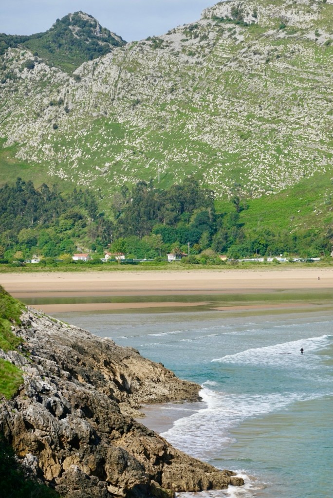 A hidden cove near Pontarron came into view with its lone surfer dwarfed by the monumental mountains at its back.