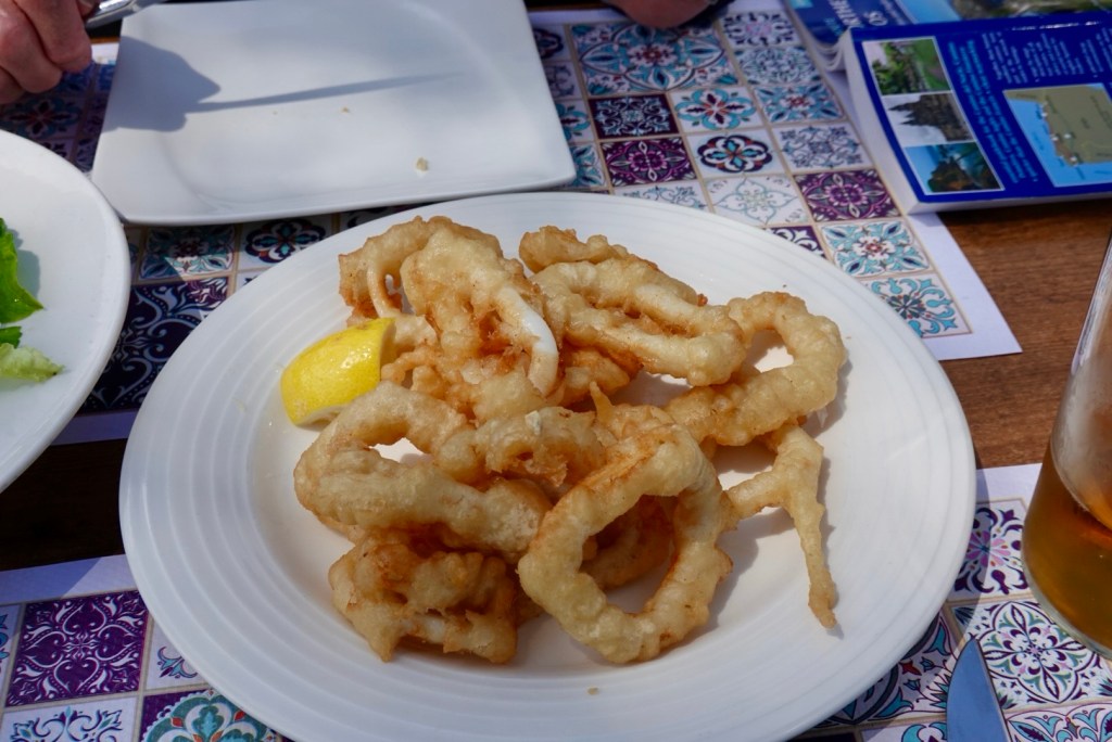 Despite our limited effort we were really hungry and headed for a nearby seafood restaurant complete with multiple large seawater tanks housing huge lobsters and crabs. We exercised some self restraint and opted for the freshest of salads with calamari. Once again the photo is for Ginnie as she requested some examples of Catabrian food!
