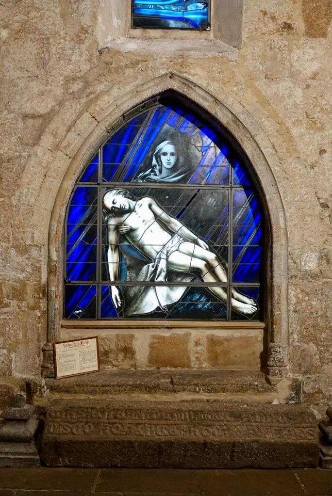 The stained glass of the church had been replaced more than forty years ago because it was in a very poor state of repair. The Cantabrian glass artist had created simple glass panes designed to maximise light in the interior. However, he was allowed one window on which he could release his full talents. We thought it both beautiful and quietly moving.