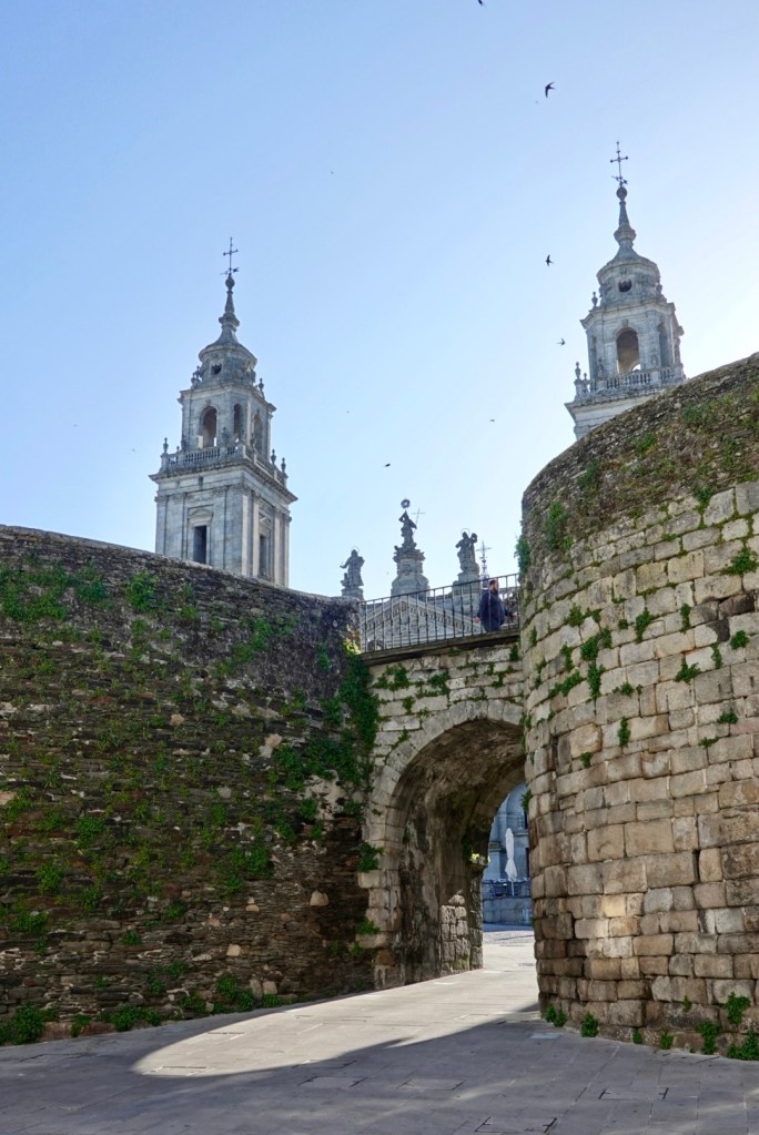 After the rigours of yesterday we opted for a slightly more leisurely start with breakfast at 8 am, and were back in the saddle by 8 45am. As it was a Saturday morning Lugo was decidedly sleepy after the raucous activities in the tapas bars yesterday evening! It made it easy to make our way out of the city. Our wonderful hotel was located right underneath the ancient walls beside one of the very few gates, and so we were able to slip out of the old city and onto modern tarmac to access the Roman bridge over the River Mino. We passed the ancient Puerta de Santiago in front of the cathedral which has been used by pilgrims for hundreds of years. Our friends, Brian and Liz, had recently had a walking holiday in Portugal, and had crossed and re-crossed the River Minho and we pondered the river’s journey as it makes its way from Galicia to the Atlantic Ocean.